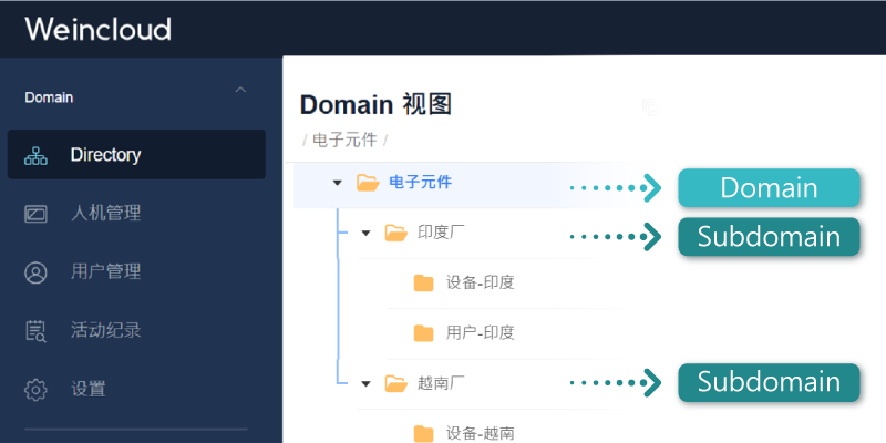 以下圖為例: 一家跨國電子公司,分別在越南、印度等地區(qū)設廠。管理者將設備、操作人員分配至各地區(qū)的資料夾下,最后設置操作權限,立即完成權限管理。